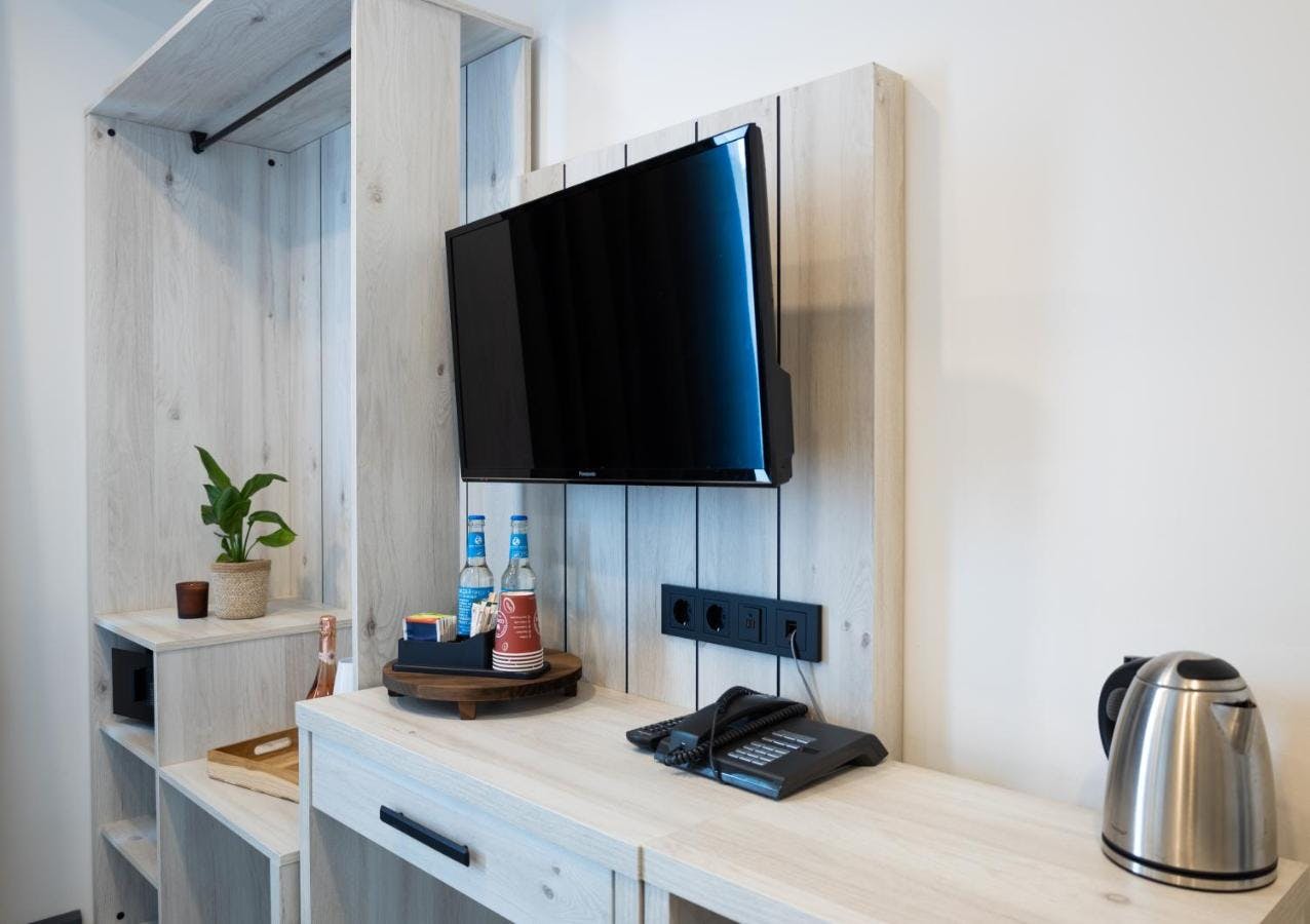 Außerdem gibt es im Zimmer eine Tee- und Kaffeestation, einen Haartrockner und Bügeleisen und Bügelbrett sind auf Anfrage erhältlich.